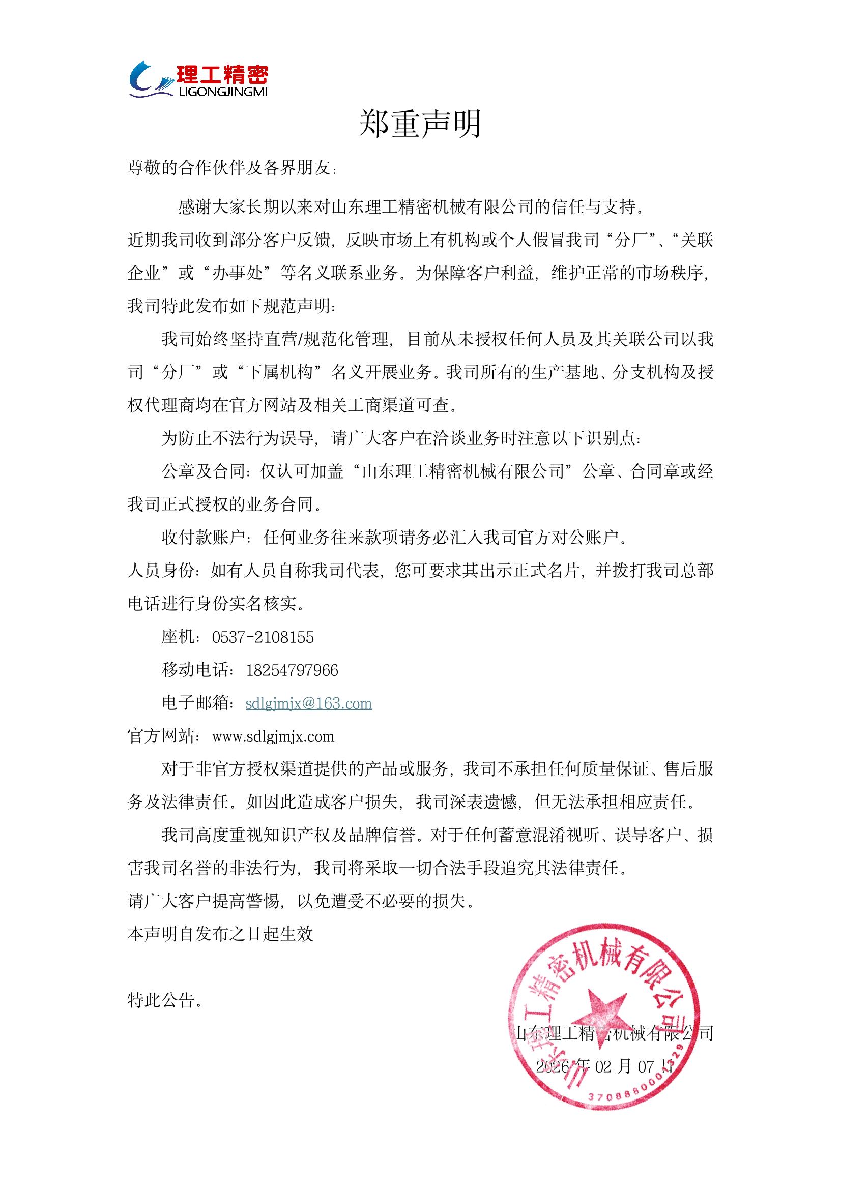 山東理工精密機械有限公司鄭重聲明