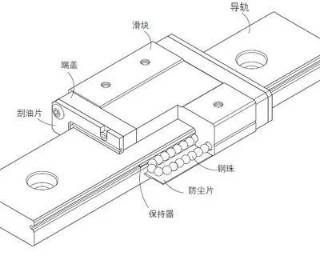 滾動直線導軌副一般由導軌、滑塊、滾動體、返向器、保持架、密封端蓋及擋板等組成,以滑塊和導軟間的滾動體滾動代替相對接觸滑動。當導軌與滑塊做相對運動時,滾動體將沿著導軌上的經(jīng)過溶硬和精密磨削加工而成的滾道滾動,在滑塊端部滾動體又通過返向裝置(返向器)進入返向孔后再進入滾道,從而使得滾動體周而復始地進行滾動運動。返向器兩端裝有防塵密封端蓋,可有效地防止灰塵、屑末進入滑塊內(nèi)部。